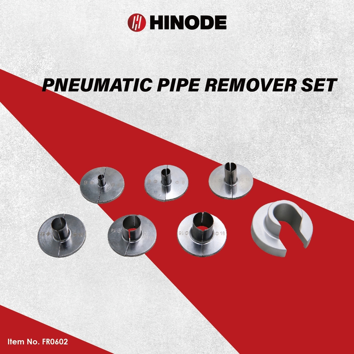 Item No. FR0602 PNEUMATIC PIPE REMOVER SET ● Specially designed to remove the adaptor of pneumatic pipe (New/Old type) ● Size: 6.8.10.12.14.16 (7 pcs) ● Applicable: VOLVO, SCANIA, FUSO, HINO, UD. etc